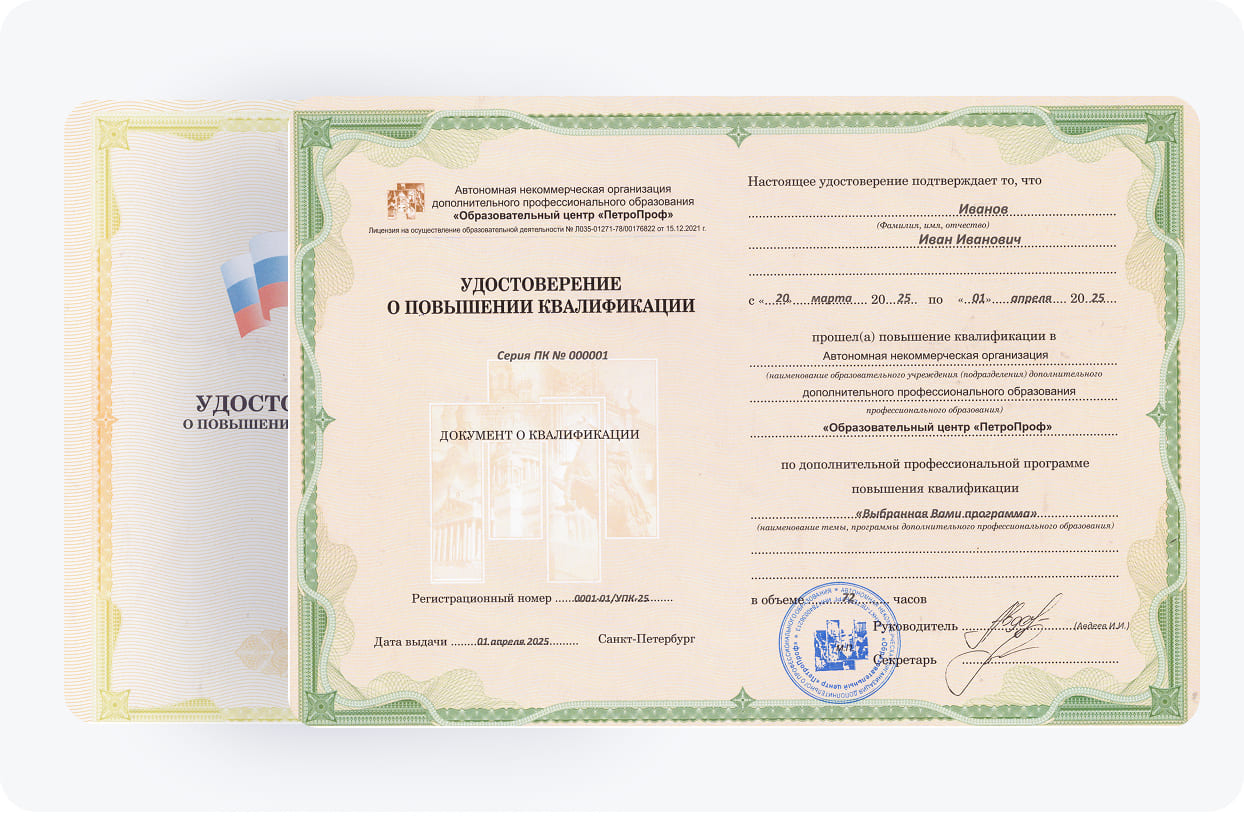 Если вы желаете открыть новые карьерные перспективы в рамках профессии, записывайтесь на обучение в "ПетроПроф". Лекции и занятия проводятся опытными педагогами, которые с удовольствием передадут вам свои знания и навыки. С нами вы сможете получить повышение квалификации просто, быстро и комфортно!